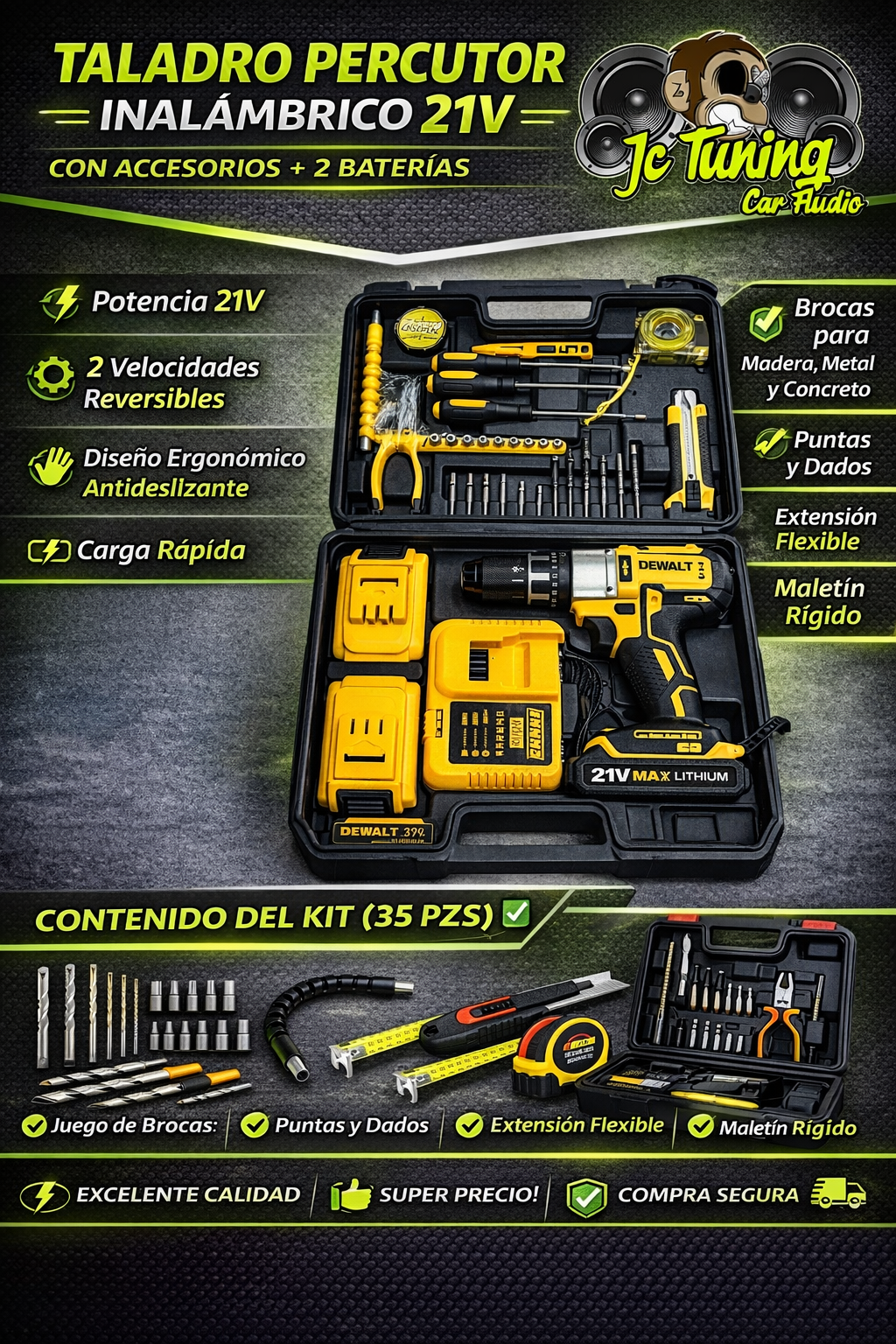 Gracias a su potencia, versatilidad y completo kit de accesorios, podrás perforar, atornillar y trabajar en múltiples superficies de forma rápida y profesional.